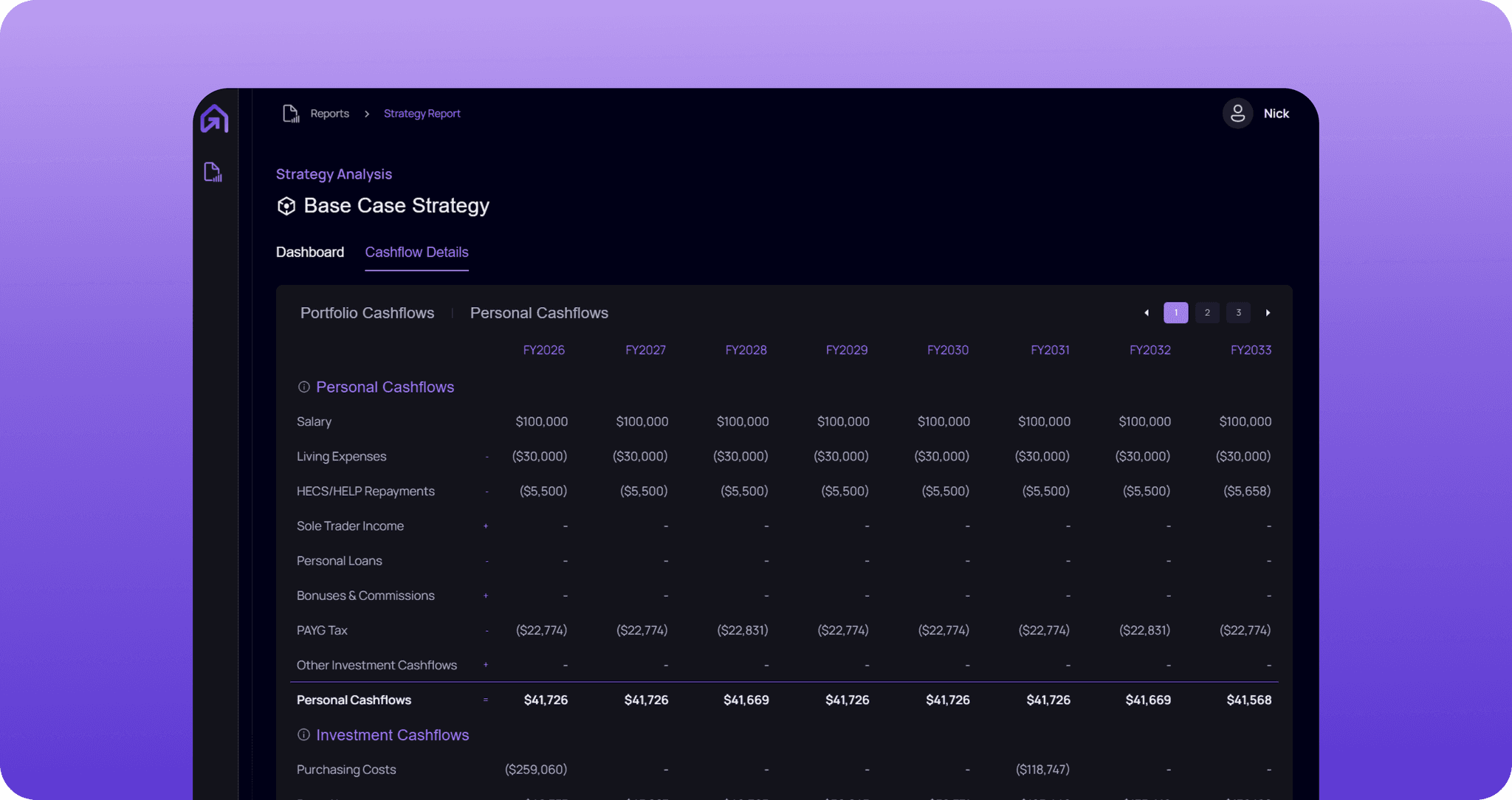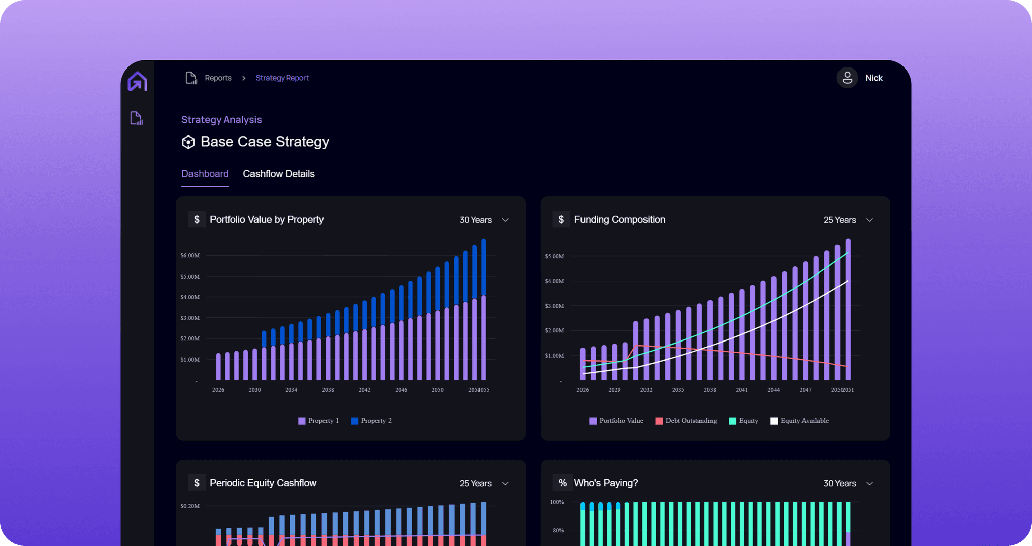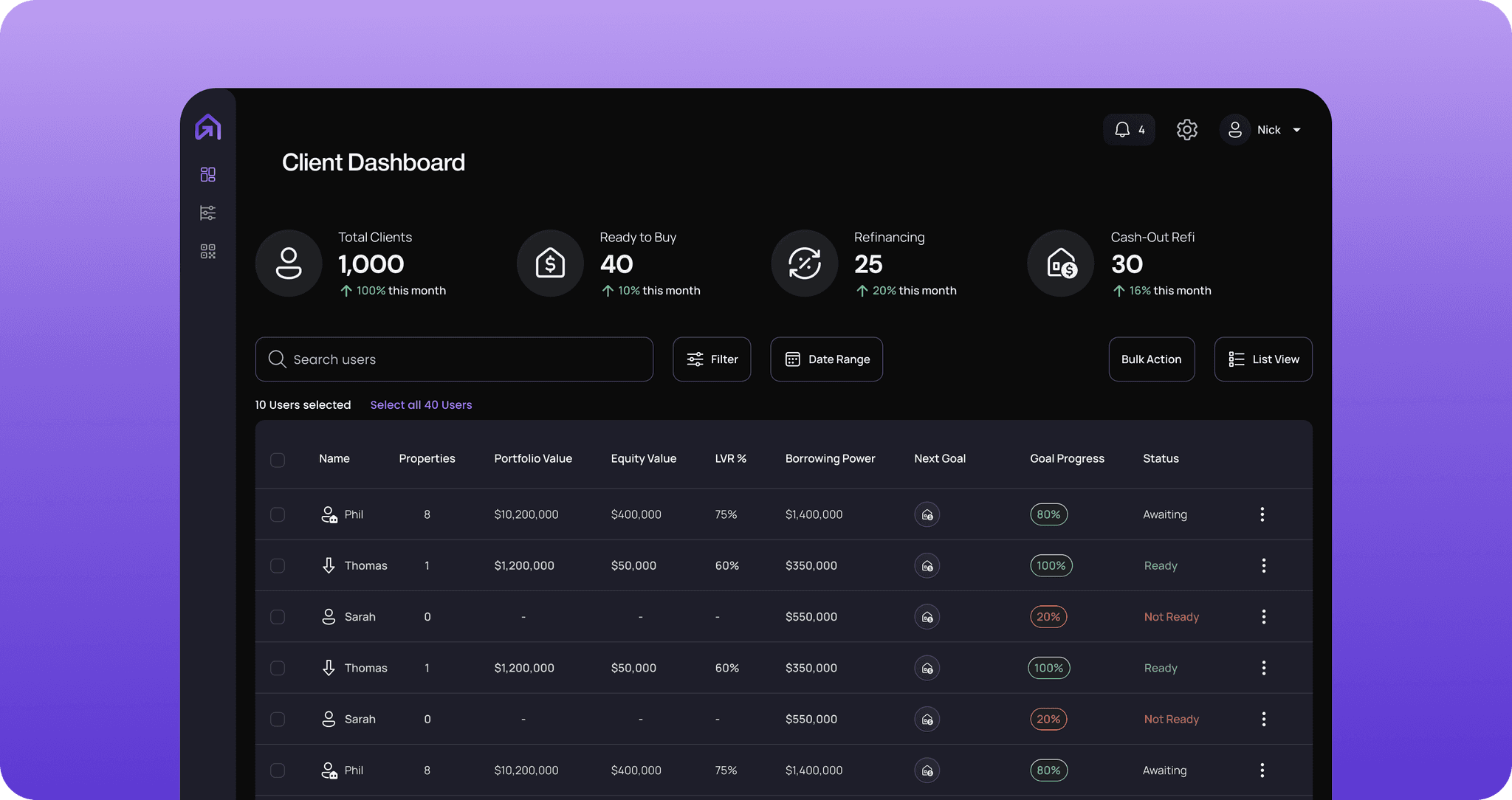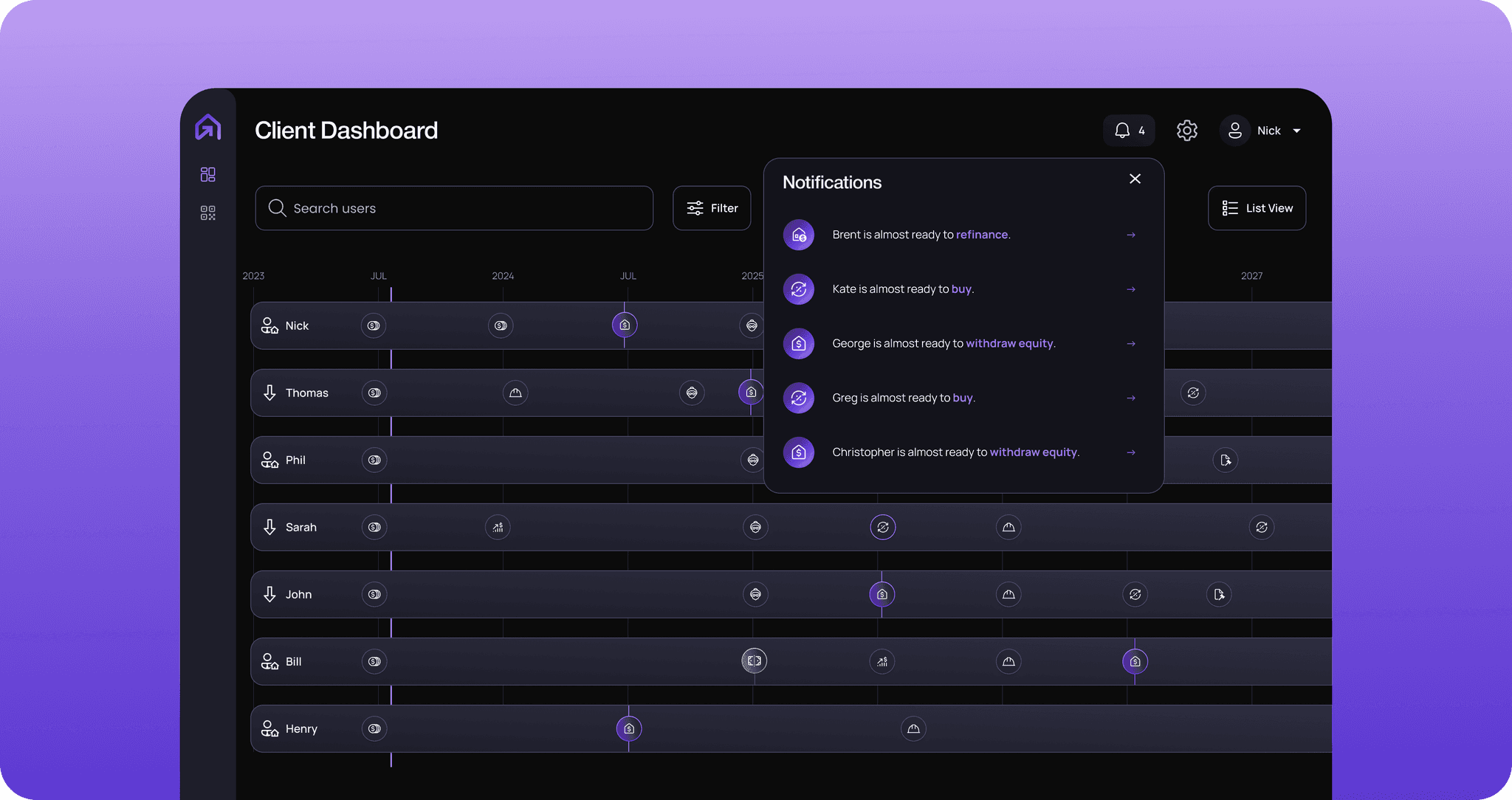 See every client at a glance and track their ‘base case’ on a live timeline with monthly PropTrack updates.