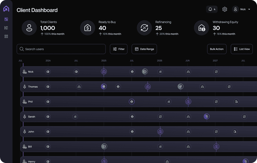 Get ahead of refinances and key events years in advance, plus alerts as clients near equity/borrowing thresholds you set.